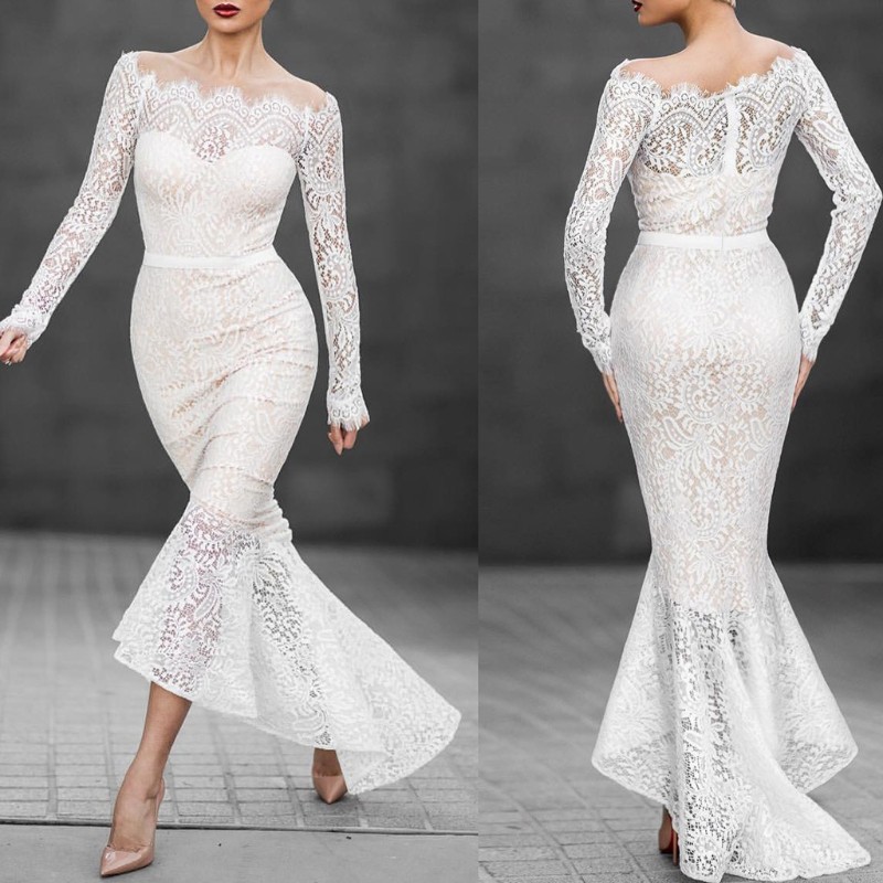 Women Wedding Dress Long Sleeve Boat Neck Lace Fishtail Evening
