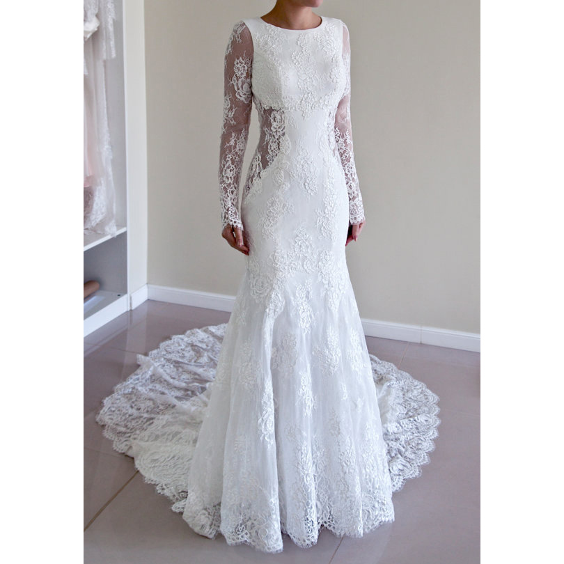 White Lace Mermaid Wedding Dress Long Sleeve Fishtail Wedding Gown